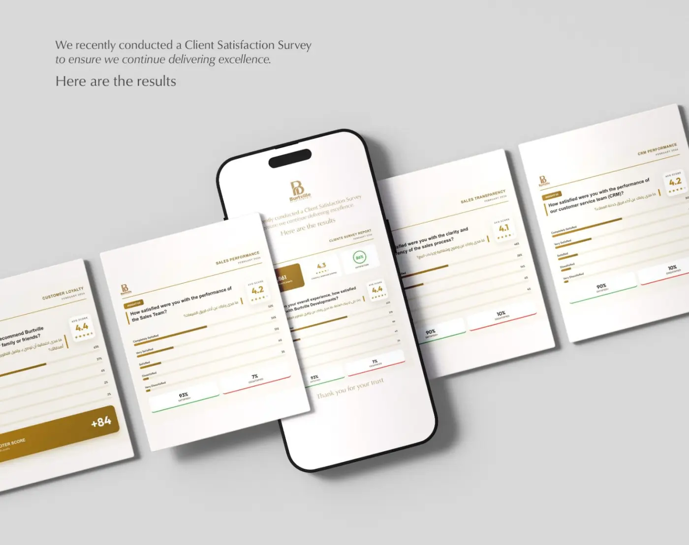 The survey was based on five main pillars presented directly to buyers. According to the key performance indicators, 93% reported overall satisfaction with Burtville Real Estate Development and the performance of its sales team. Satisfaction with the performance of the customer service team and the clarity and transparency of sales procedures reached 90%, while more than 86% of respondents indicated they would recommend Burtville to family members and friends.