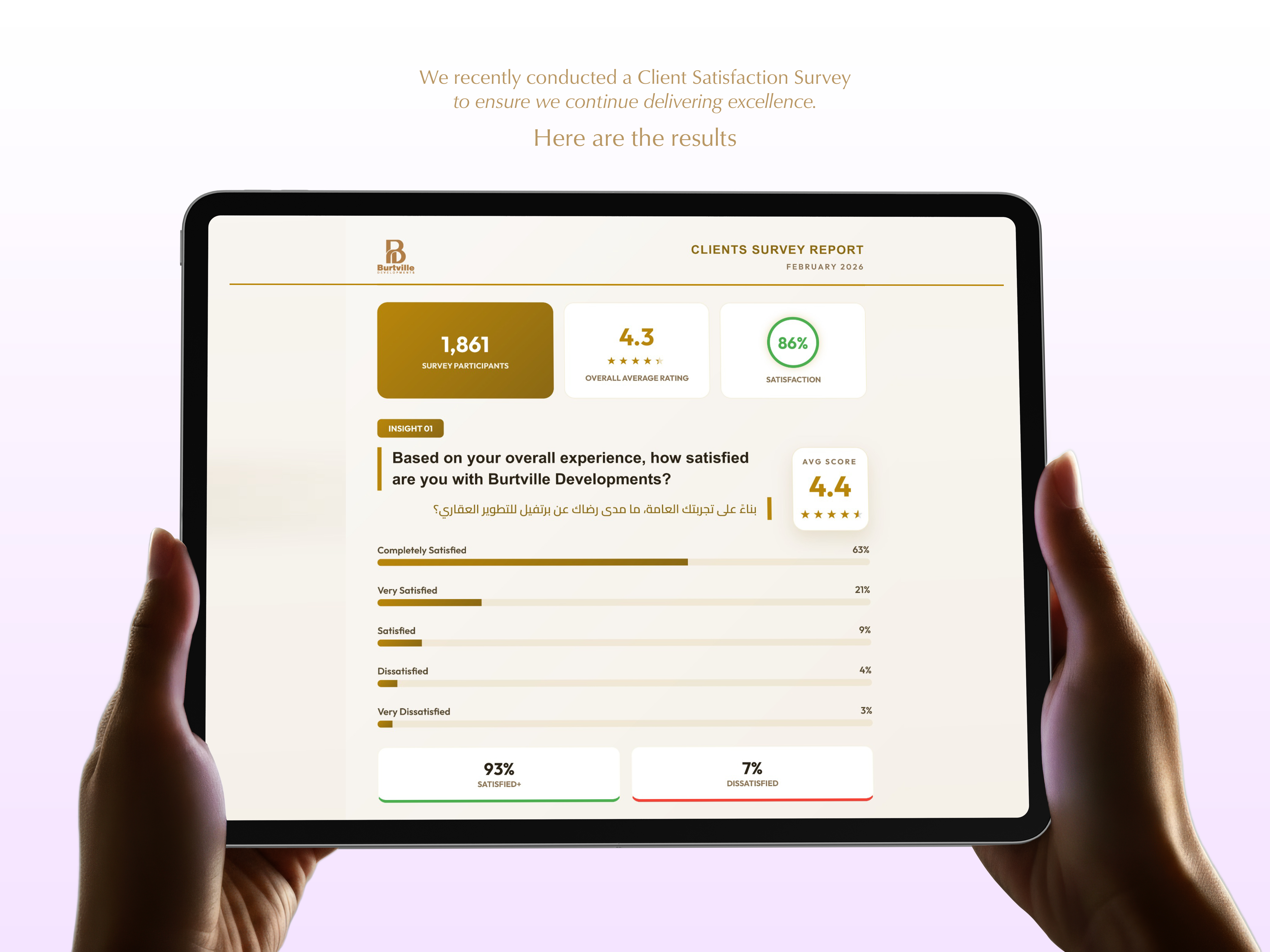 The survey was based on five main pillars presented directly to buyers. According to the key performance indicators, 93% reported overall satisfaction with Burtville Real Estate Development and the performance of its sales team. Satisfaction with the performance of the customer service team and the clarity and transparency of sales procedures reached 90%, while more than 86% of respondents indicated they would recommend Burtville to family members and friends.